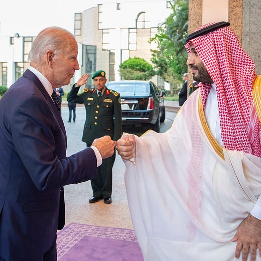 It might be argued this tête-à-tête was the only reason for Biden’s stop in Jeddah (although I’d note that his attendance at the GCC+3 summit and meetings with Arab leaders such as UAE President Sheikh Mohamed bin Zayed and King Abdullah II of Jordan were also significant). The US needs Saudi Arabia to increase the flow of oil to alleviate the pain at the pump and forestall a recession. The price was Biden’s moral high ground, which he sacrificed by meeting with bin Salman, who is believed to have ordered the murder of Saudi-American journalist Jamal Khashoggi in 2018.