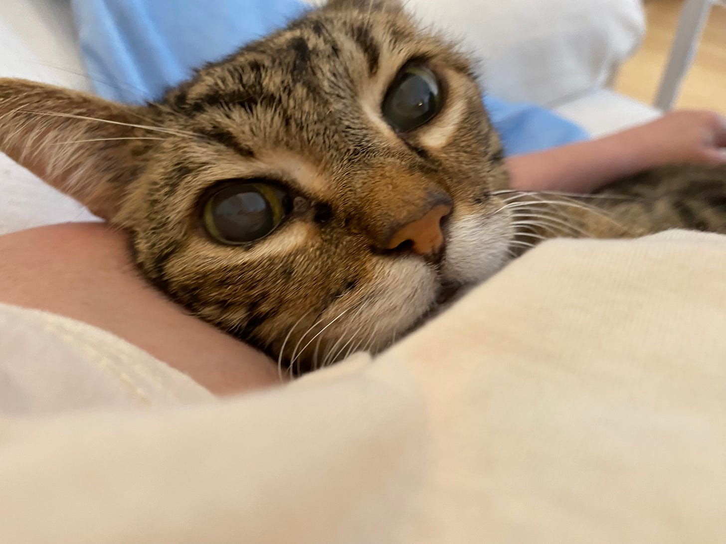 He’s beside me now. He doesn’t seem to be in pain. He’s surprised me, these past few days, by eating lustily whenever I offer him food. He purrs when I hold him.
