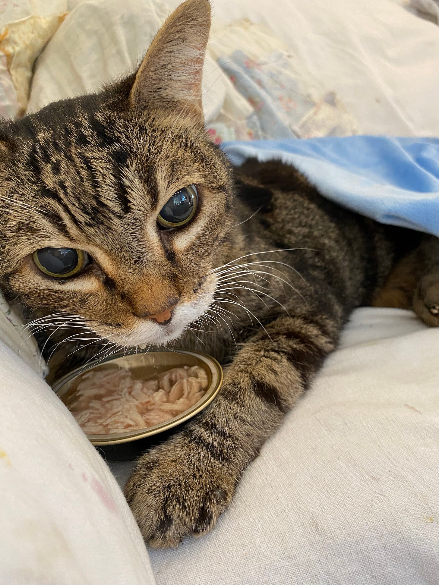 The other cats know perfectly well what’s happening. They aren’t even whining and trying to steal his food when I feed him. Even though it’s Chicken Sheba.