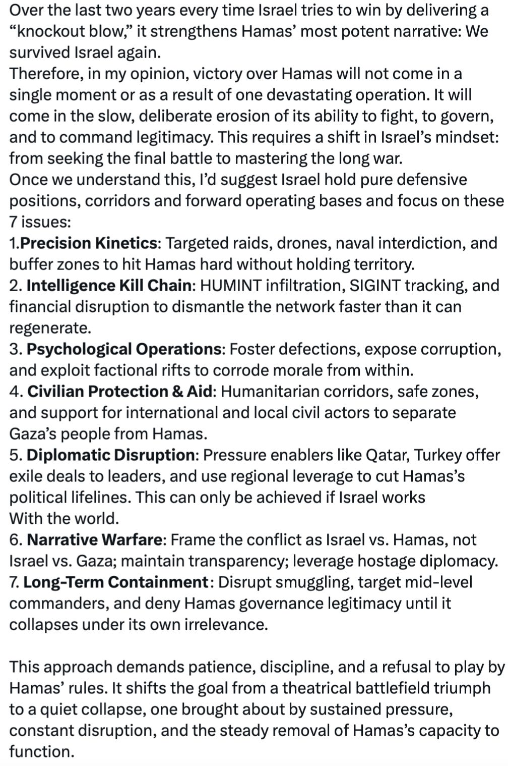 Claire: The thing is, you completely dismissed the idea that Bibi could have any kind of motive beyond the utterly base and self-serving. But when you think of just declaring the war of failure, strategically … all of this suffering in Gaza has been for nothing. As is the entire world’s reaction to it. It’s leaving Hamas in place, it’s …