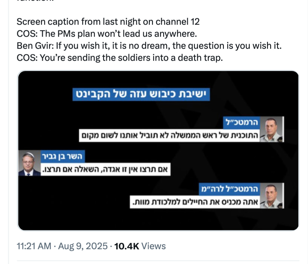 The UN Security Council will hold an emergency session today (it’s now Sunday in Paris) to discuss the Israeli security cabinet’s approval of a plan to seize Gaza City. The hostages’ families have called for a general strike over the decision.