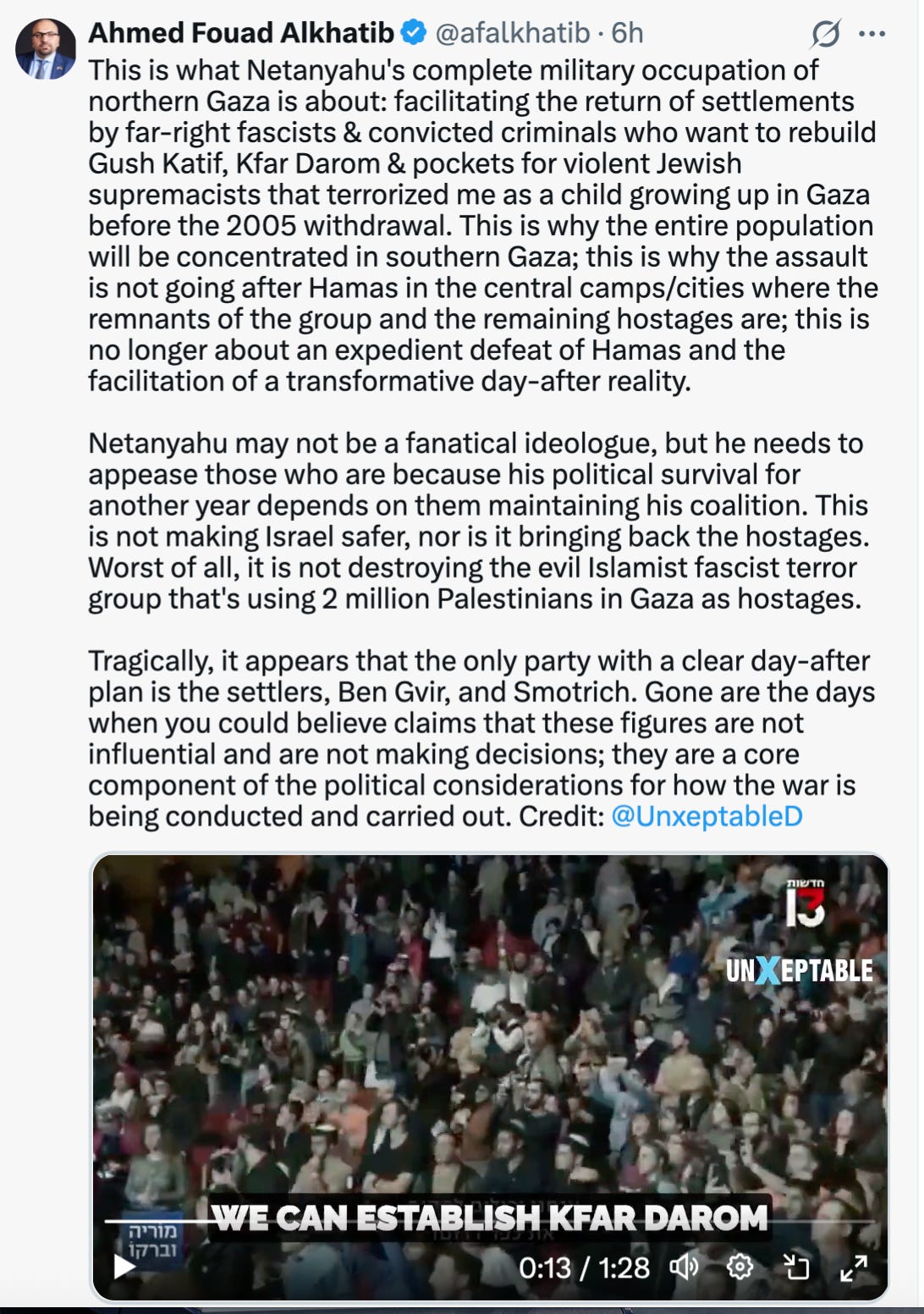 So the issue is distribution of food. UNRWA had over 4,000 distribution points, GHF has four. The journey to get to these aid sites is treacherous, it’s difficult. But the focus, again, has always been on, for the last two months, “Israel’s starving, Israel’s not allowing in food, Israel’s preventing distribution”—no. That is not true. And I would urge your listeners to look at the feed of my very good friend, on X, Ahmed Fouad Alkhatib. He is fantastic. He’s been on my podcast a number of times. And we speak about this all the time.