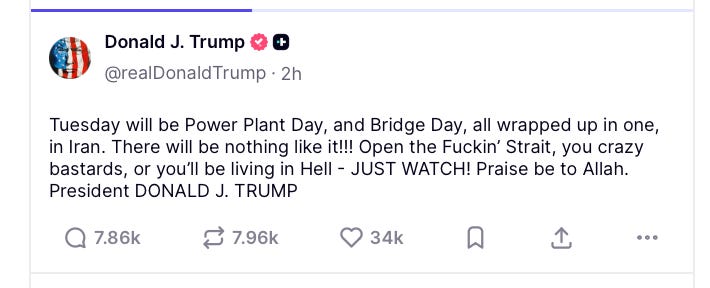Yes, it’s real—though I don’t know whether he really wrote it; it’s not quite his prose style. But this certainly was, for real, posted on his Truth Social account. On Easter Sunday. (So much for that Nobel Peace prize.)