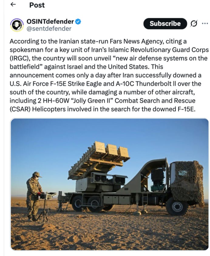The regime was already treating the downing of the place as a victory, which tells you how valuable a living hostage would have been. Captured airmen are particularly useful for propaganda because they condense so many political emotions into a single figure: vulnerability, honor, vengeance, national embarrassment. He would have been made to stand for American impotence, or Trump’s recklessness, or Iran’s moral and military superiority. It would have been a sustained, God-awful national ordeal, and it would have torn us apart even more than we’re torn already. I’m so glad we’ve been spared that.