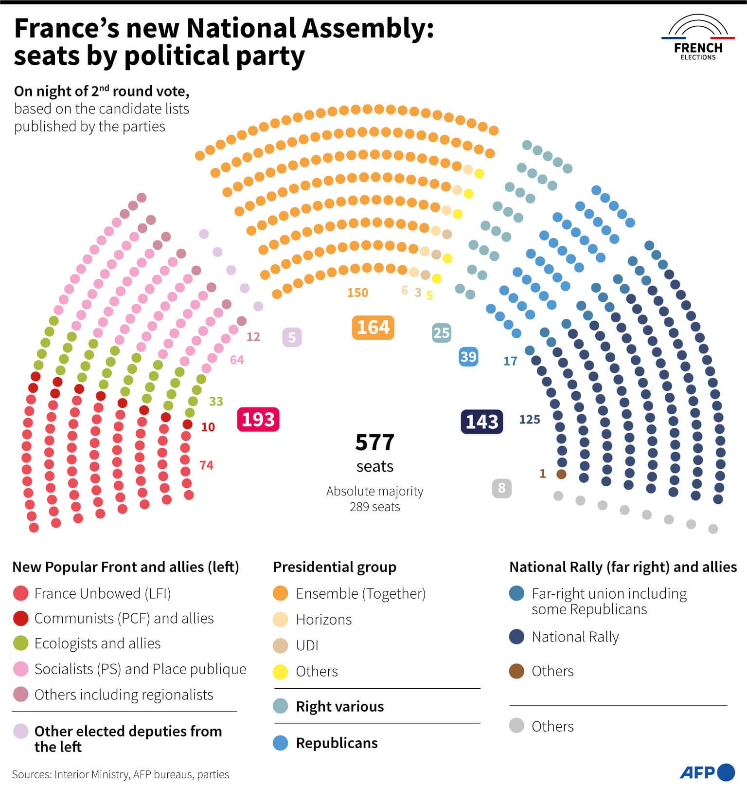 Attal announced that he would resign as prime minister just after the results came in, but Macron refused to accept his resignation. There’s talk of a broad coalition among all the parties except the far-right and the far-left, to “stabilize the situation.” Some members of Macron’s government said they’d consider forming a group with the Socialist Party. The LFI says they won’t participate in a coalition if Macron’s group is in it, and vice-versa. But the Ecologists say they’re not sure. Mélenchon is insisting loudly that he should be the prime minister. (Good luck with that.) Bompard said that the Popular Front intends to implement its entire program in its entirety, no exceptions. (Good luck with that.) The Socialist’s negotiator said she’d welcome the support of the leftmost members of Macron’s party in a coalition left-wing coalition. The Republicans said they won’t work with any party on the left. And so forth.